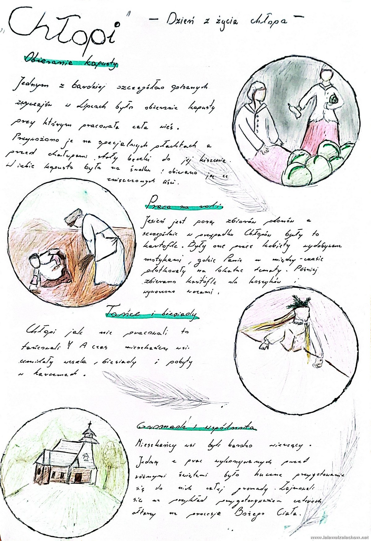 oraz wyposażenie i wygląd ich domostw. Uczniowie zaprezentowali plakaty, omówili wykonane prezentacje, przygotowali dla każdej osoby opracowanie zagadnienia i inne atrakcje np. quizy. Praca nad projektem pozwoliła lepiej zrozumieć mentalność mieszkańców wsi końca XIX wieku. Młodzież dostrzegła, jak bardzo nasza kultura oraz zwyczaje osadzone są w dawnej obrzędowości, a wiele