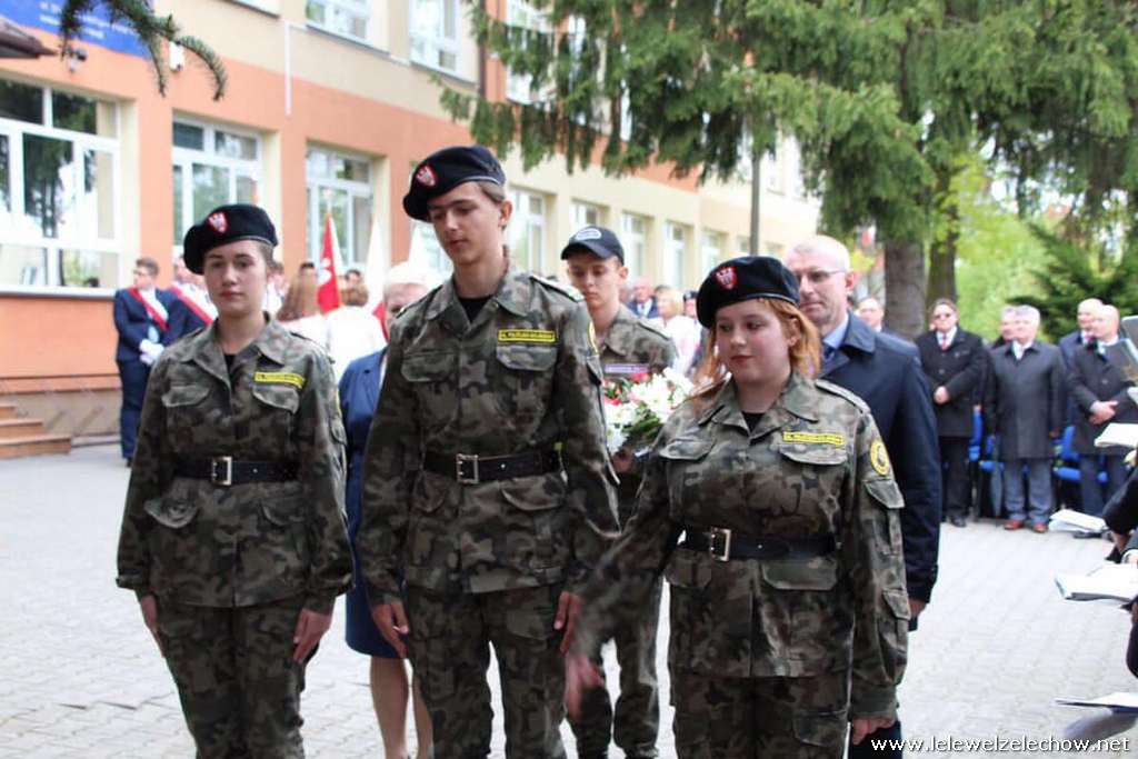 Naszą delegację stanowił poczet sztandarowy w składzie: Jakub Rękawek, Karolina Mikulska i Patrycja Woźniak. Kwiaty składali uczniowie mundurowi klasy I: Filip Galas, Katarzyna Janiec i Roksana Świesiulska.